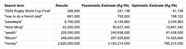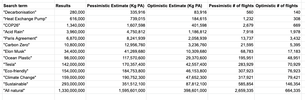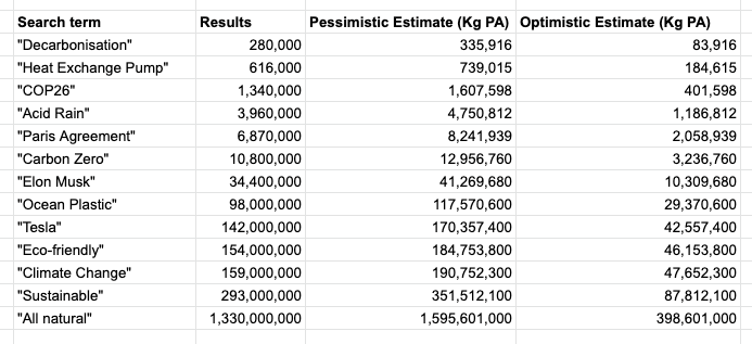 There’s a common trend connecting the search terms and their carbon footprint: serious subjects contribute less, fluffy badly defined terms contribute more.